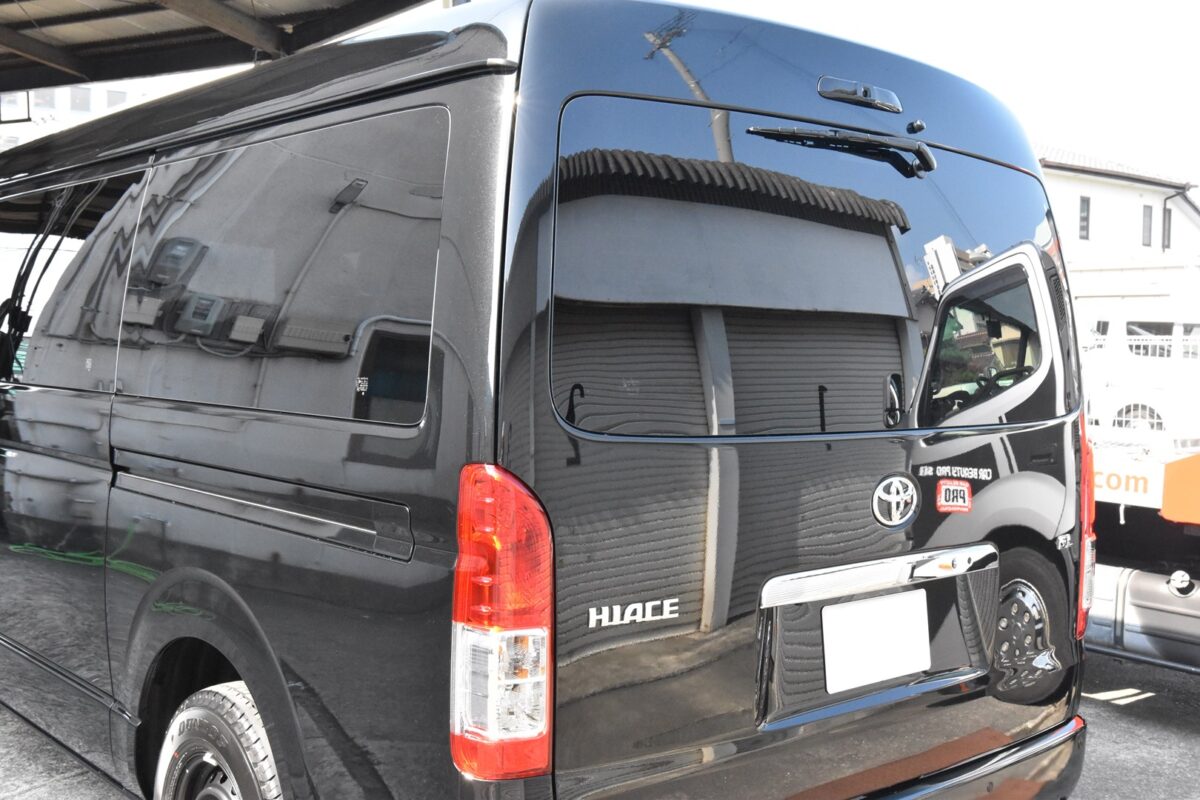 熱成型が完了したのでフィルムを貼っていきます。 ハイエース完成です。 リアガラス全面に一番濃いスモーク遮熱フィルム、GY-3IRを貼らせていただきました。 こちらはハイエースワゴンGLなので、通常よりも大きいサイズ。 リ..