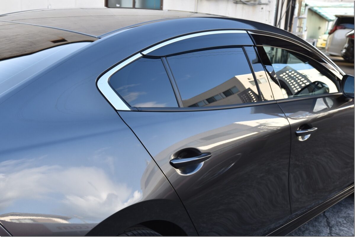リアガラスの窓は湾曲しているので、そのままフィルムを貼ることはできません。 ガラスの曲面に合わせるため、熱成型を行います。 すると、こういう風にガラスにピタっと合うフィルムが完成するんです。 サイドのドアガラスは外して貼..
