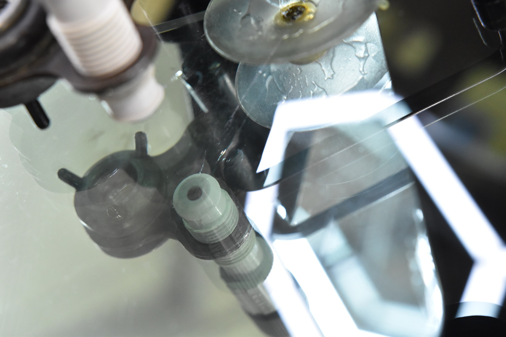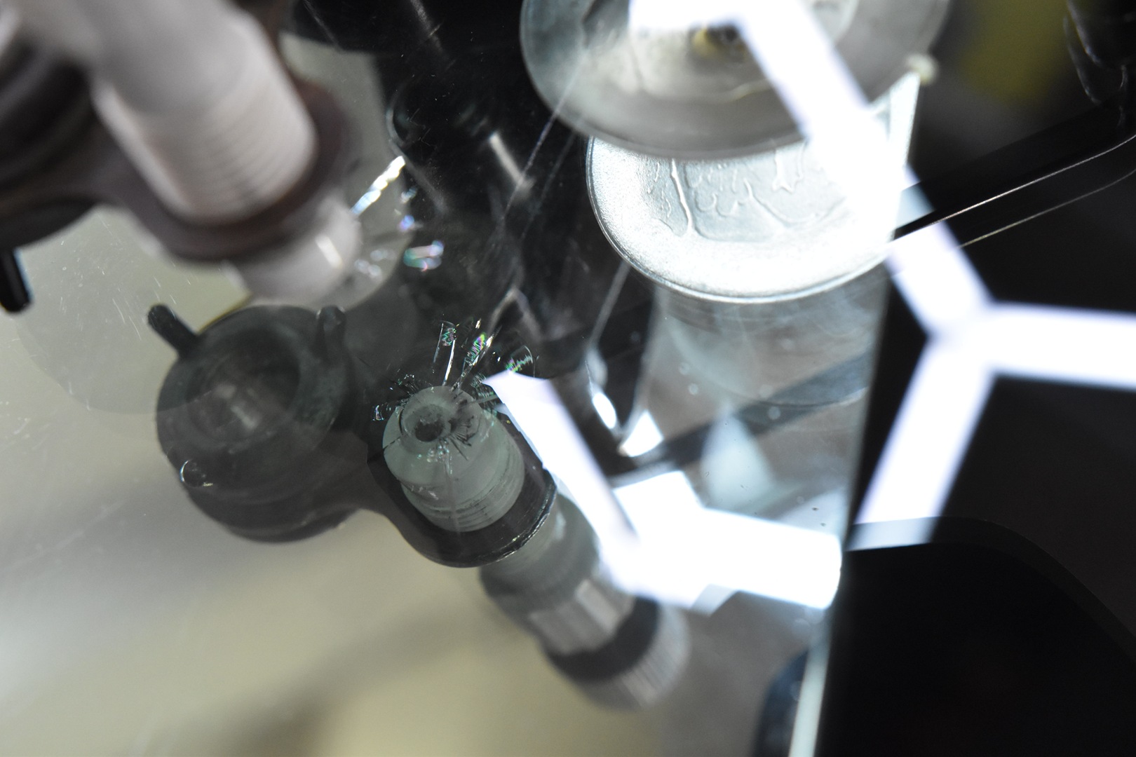 一般的に使用されているUV硬化型レジンは、ガラス外側から光を当てるためにドリルホールの底に気泡ができやすくなります。
