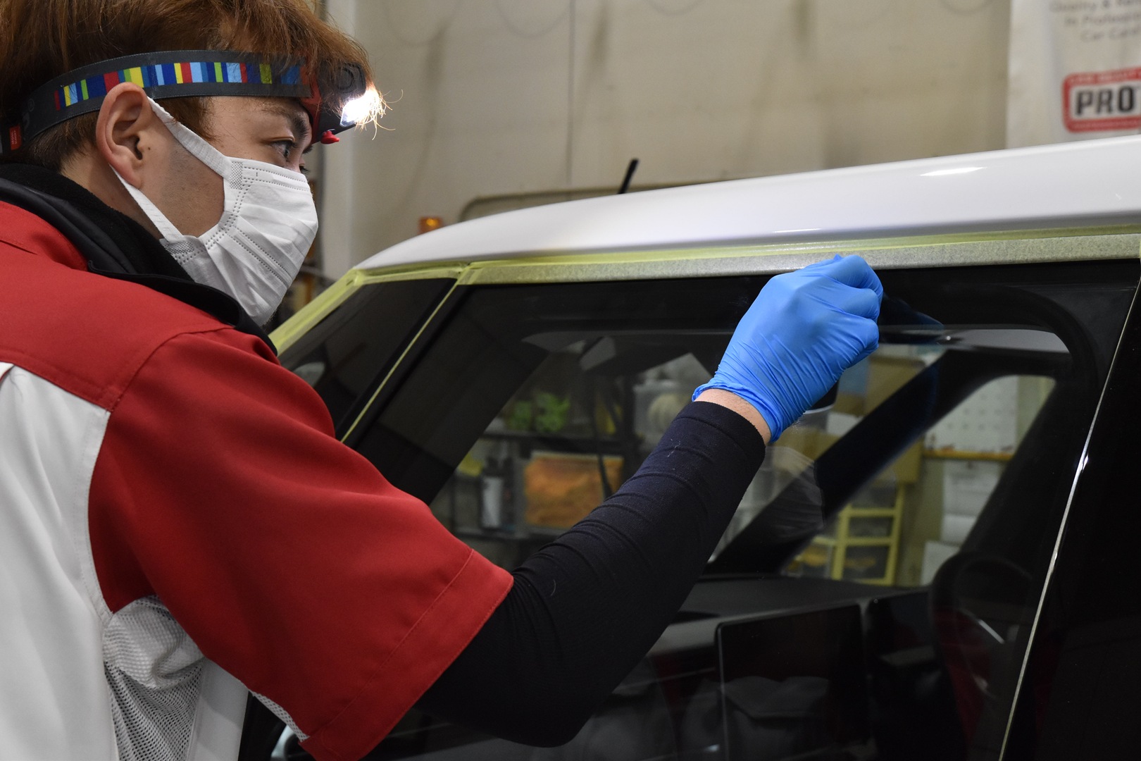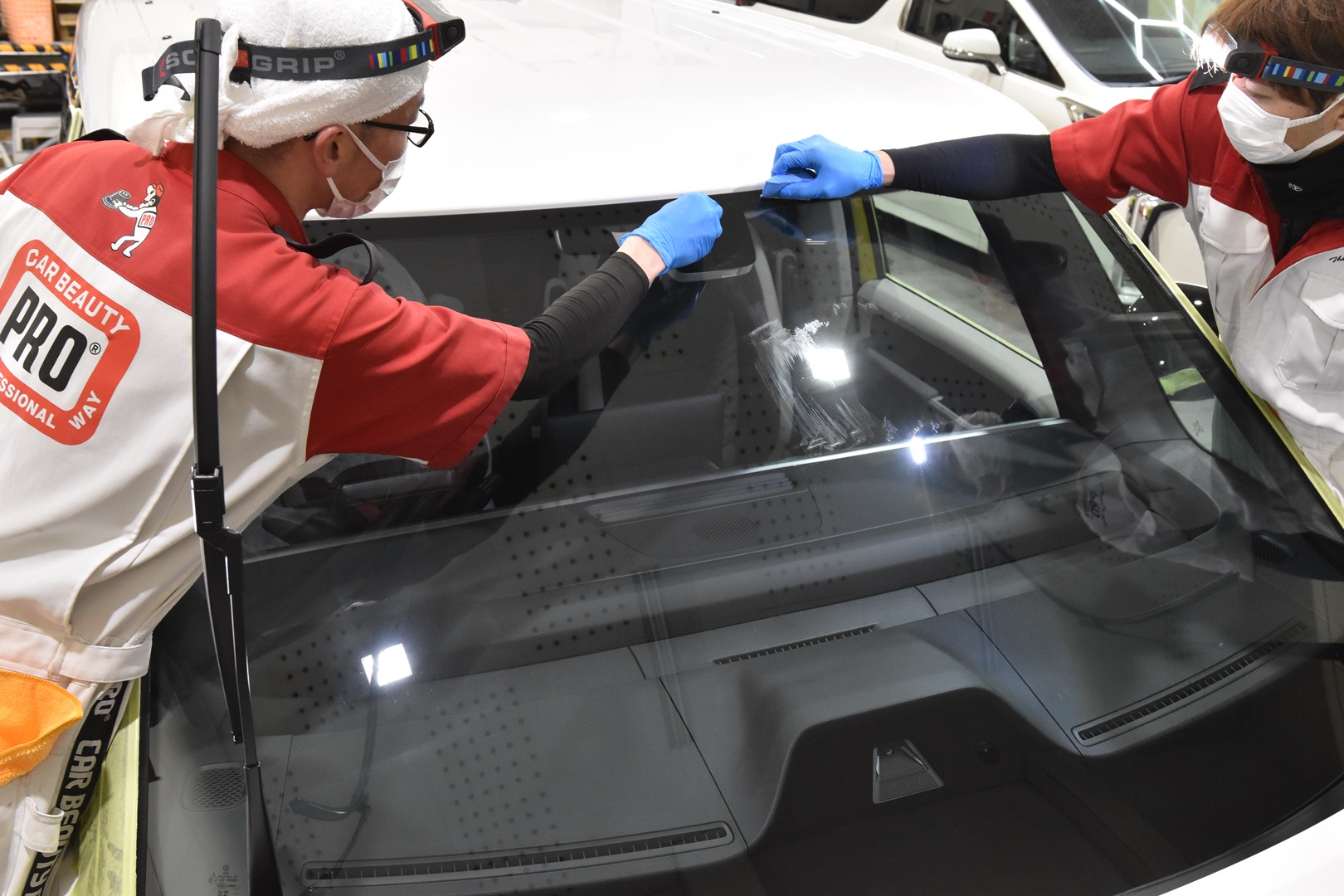 今回はフロント3面にウィンドコーティングのご注文もいただいたので、一緒に施工します。