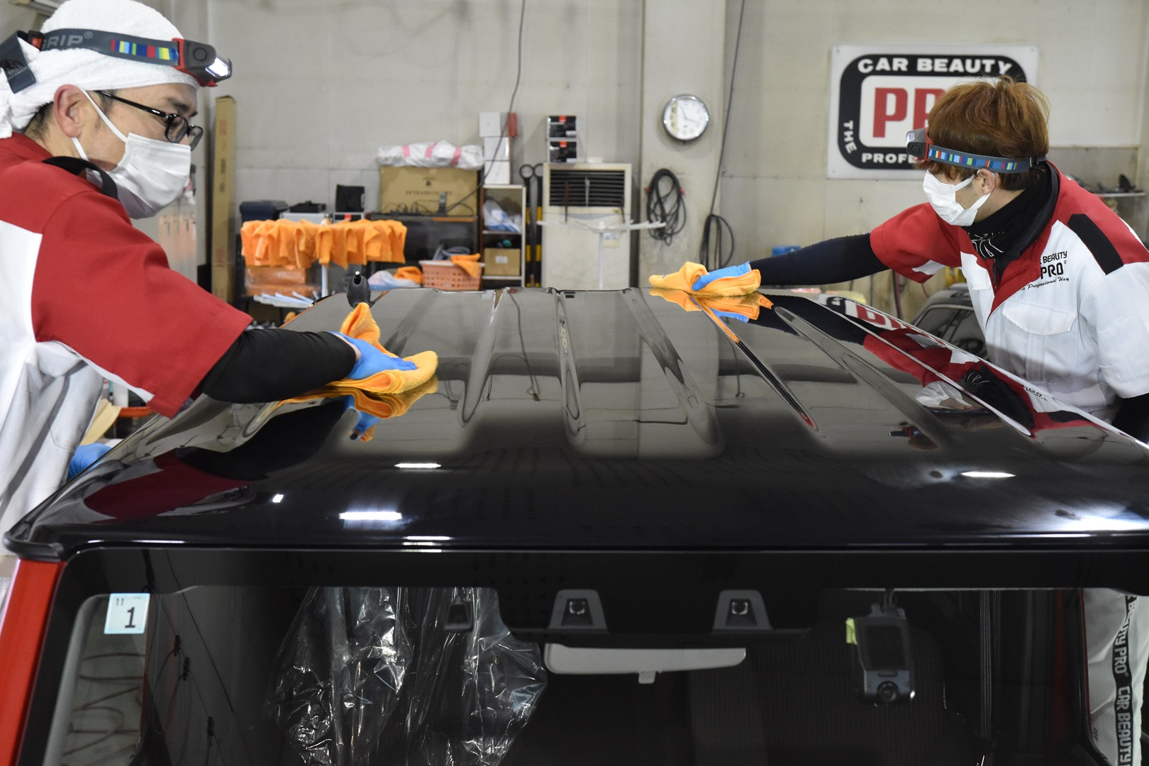 新品のマイクロファイバーを使用するのはもちろんですが、クロスの持ち方、拭き方、あらゆることをマスターしなくてはいけません。