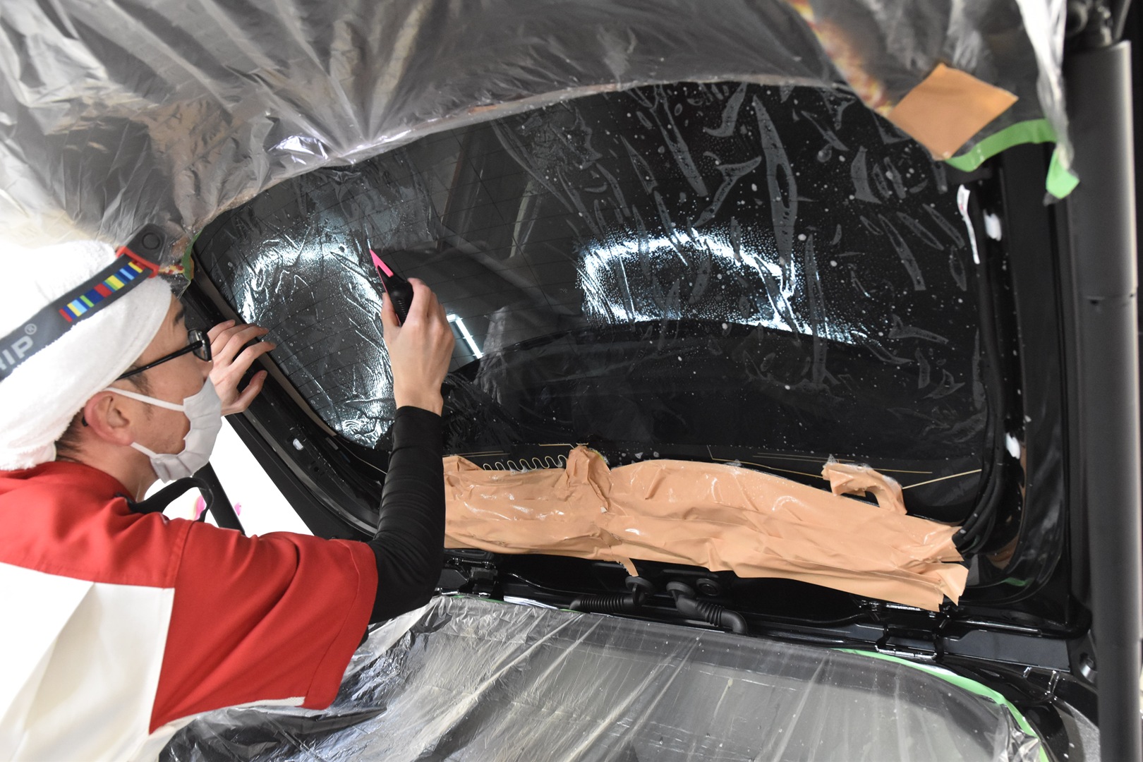 リアガラス全面にスモーク遮熱フィルムのプレミアムシリーズを貼っていきます。