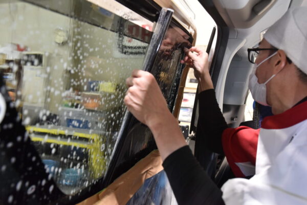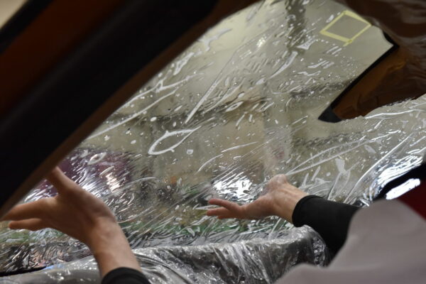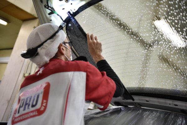 サンルーフを貼っているスタッフ。マスキングテープにビニールがついているマスカーと...