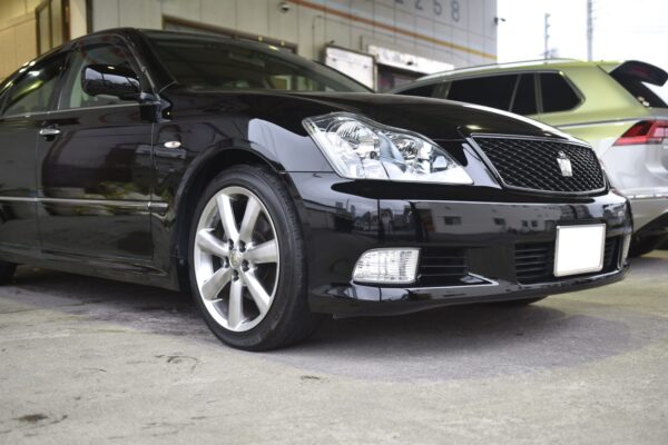 研磨前のクラウンは、塗装の状態があまりよろしくない。 年式を考慮すれば、それでもいい方じゃないでしょうか。 普段は見えにくいサイドの傷なども、SIの作業場の中ではきっちり見えます。 カラーコード202と言われるトヨタの黒ソリッド。 今は...