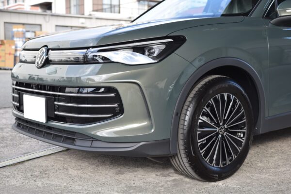 新型ティグアン。シプレッシーノグリーンメタリックという新色の良さが表現できないので、外で写真を撮りましょう。 これです。このオリーブ色のような独特のカラーが、この新型ティグアンのデザインにマッチしていますよね。 SIでガラスコーティング...