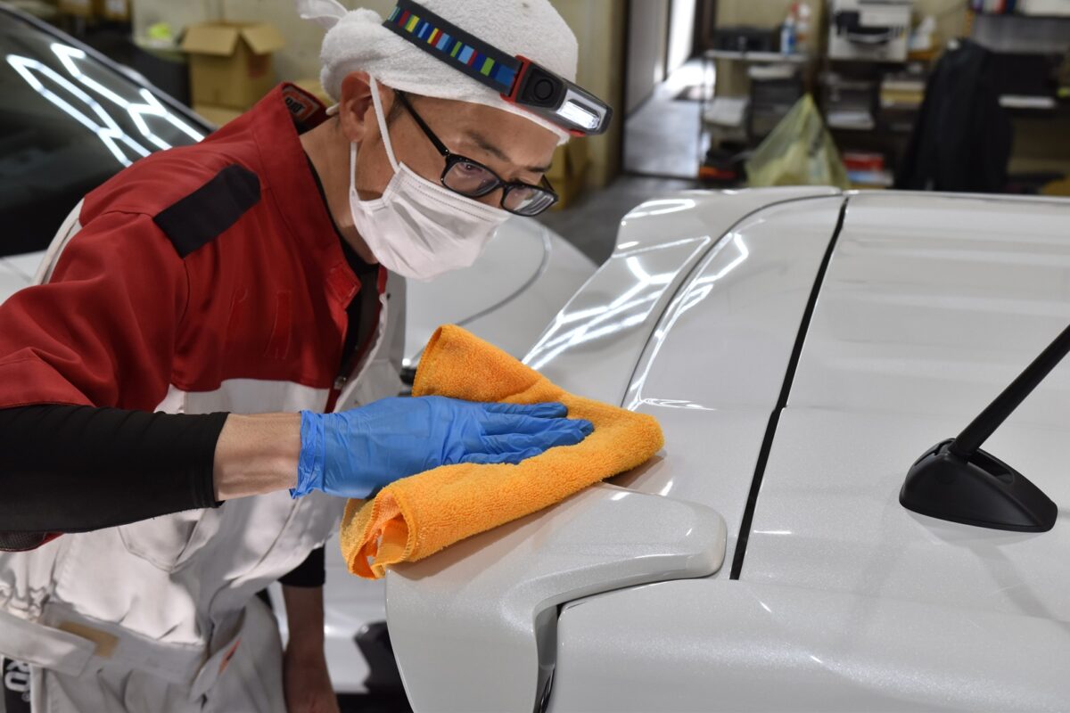 コーティングの拭き取り中。 最近は2層式のコーティングがほとんどなので、作業量は2倍になります。 当然ながらマイクロファイバーの使用量も2倍。 パールの塗装は洗車傷も見えにくいのですが、コーティングの拭き残しも見えにくい..