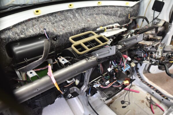 ダッシュボードは細部にまで泥が混入しており、外からクリーニングするだけでは不十分なので脱着分解し、丸洗いです。 内部のエアコンダクトも丸洗い。 水に漬けているように見えますが違います。 実は漬け置きで除菌しているんです。 ハンドルも凄い...