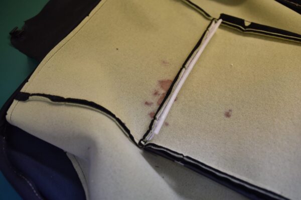 ワンちゃんが爪から出血してシートに血液のシミがついたということでクリーニングのご注文をいただきました。 黒いシートの場合分かりにくいんですが、シートカバーをめくってみると、しっかりシミになっています。 ウレタンスポンジにも付着していますね...