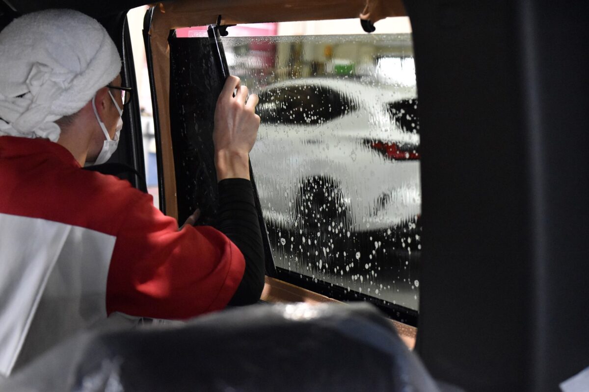 スモーク遮熱フィルムの施工中。 クラウンクロスオーバーはリアガラスがかなり寝ているので貼りにくいんです。 一人は車内に乗り込み、養生とガラスの掃除を行う。 その間にもう一人が、フィルムに施工液をふきつけて巻いておく。 車..