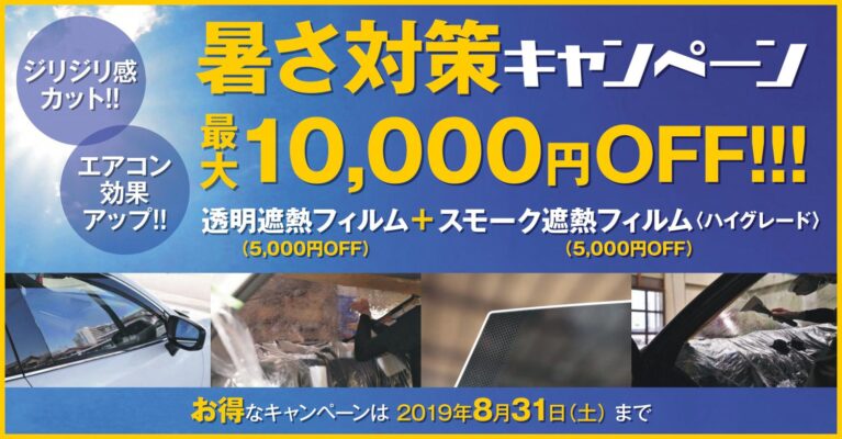 車内の冷房をもっと効かせたい!日差しのジリジリ感を軽減したい!紫外線をカットしたい! そんな皆様にご朗報です。 最大10000円OFFというお得なキャンペーンを8月31日まで行います。 透明遮熱フィルムで5000円、スモーク遮熱フィルム(ハ...