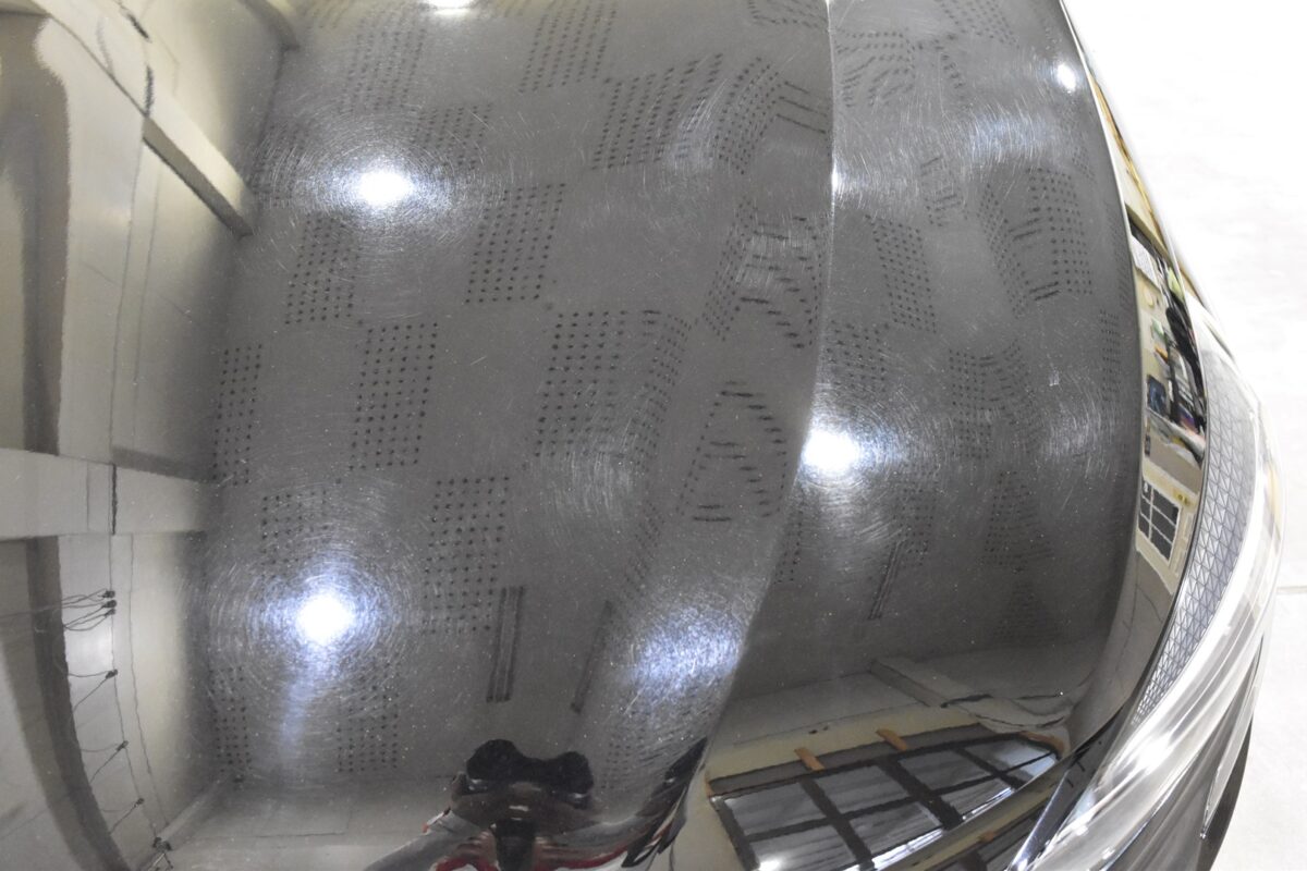 研磨前の状態。 洗車傷が深過ぎて、光沢が鈍いですね。 付着していた鉄粉の量も凄くて、触ればザラザラしているぐらいでした。 水シミと洗車傷でここまでダメージがあれば、どこまで復元できるんでしょう? はい、全く別の車みたいに..