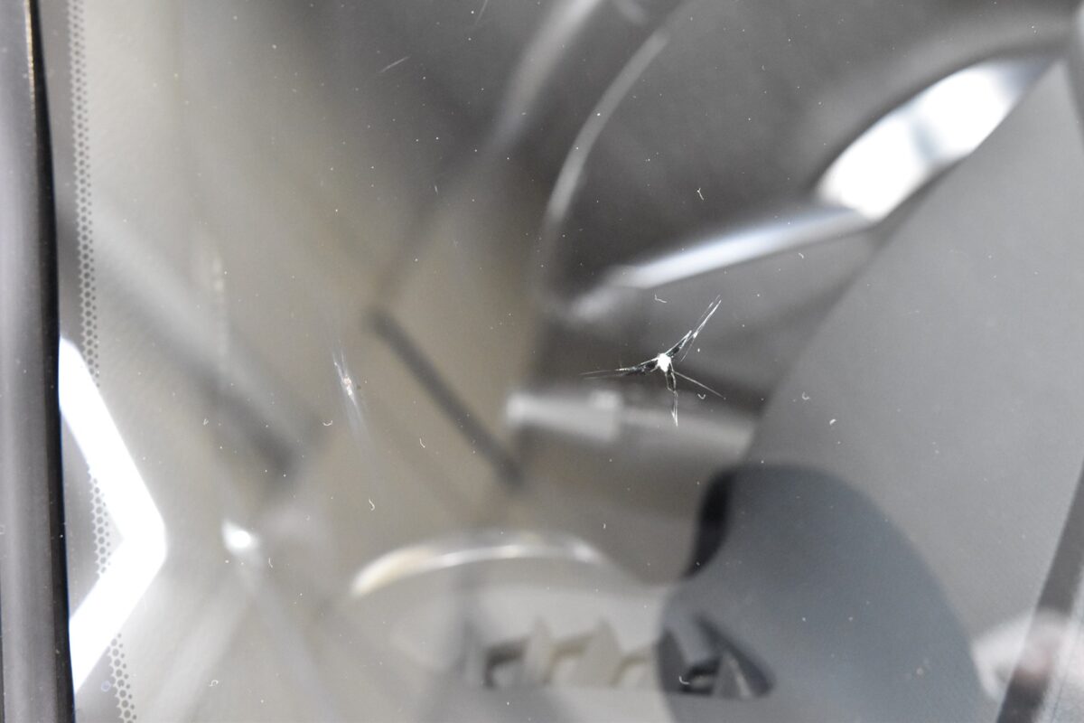 大物が入ってきました。500円玉以上のサイズのヒビは、リペアを断られることも多いです。 放っておくとすぐにヒビが伸びてしまいそうですね。 これだけ離れても、ミラーに反射してヒビが見える(笑) とりあえずこれ以上ヒビが伸び..