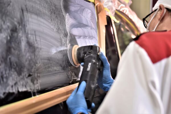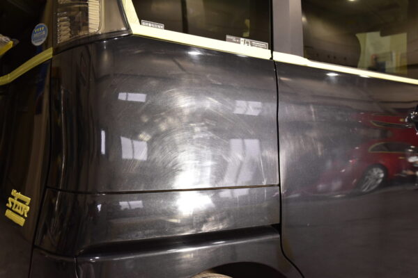 この粒のような点々が鉄粉です。 今回の事故で付着した鉄粉は粒が大きいので、爪で弾いたらポロっと落ちるものもあります。 黒のソリッドなんですが、色がくすんでしまってグレーになっています(笑) ここから研磨処理を行うことで、見た目がガラッと変...